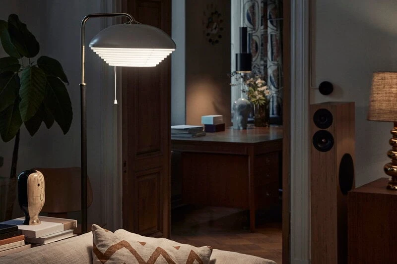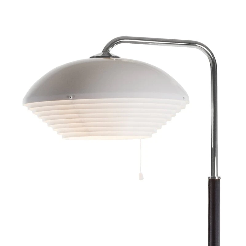 Artek’s A811 floor lamp is a well-balanced combination of different colours and materials: its leg features nickel-plated brass and black leather, and the shade is made of thin, layered metal strips that provide a smooth and warm light. A811 was designed by Alvar Aalto and released in 1965. Its appearance is similar to the lighting collection that Aalto designed in the 1950s for the National Pensions Institute of Helsinki, and its timeless elegance will easily complement modern homes and public spaces, too.
