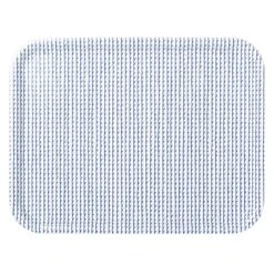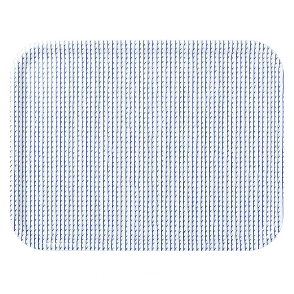 The Rivi tray, designed by Ronan and Erwan Bouroullec for Artek, features a unique textile pattern that comprises rows of long, parallel lines with delicate details. The rectangular tray is made of laminated plywood and paper.